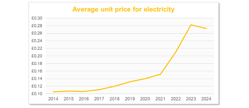 As the installation costs for a solar PV array have fallen, energy prices have risen. They have risen a lot over the last ten years. Most businesses who rely on power from the grid will have felt this impact, with the average cost of a unit of electricity rising from 11p in 2014, to as much as 28p in 2023.